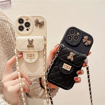 3D Bow Cartoon Bear Premium Mobile Cover PU Leather Soft With Lanyard Bag Phone Case
